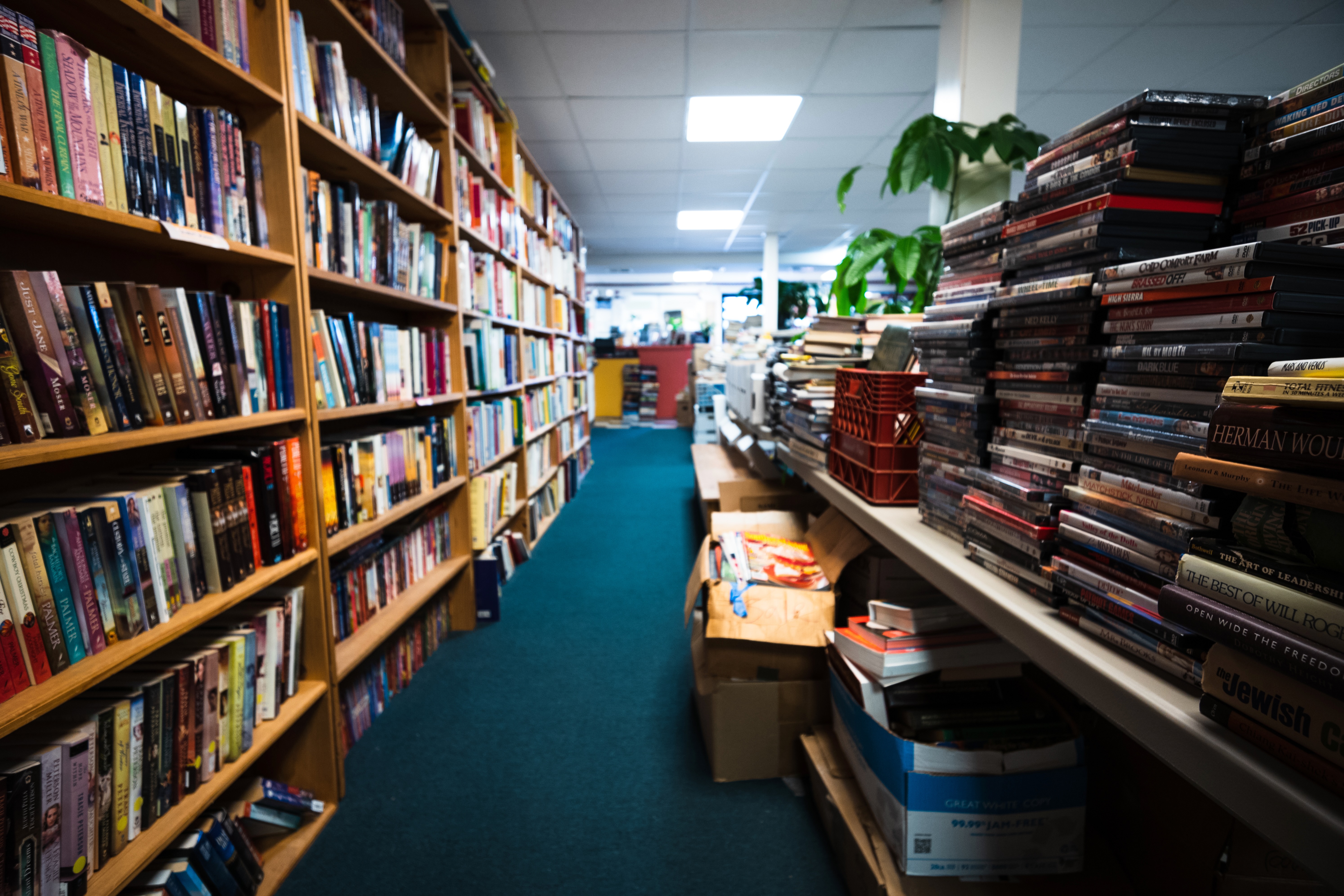 This photograph captures a cozy, cluttered aisle of a bookstore filled with towering shelves of books and stacks of DVDs, inviting exploration. The warm, ambient lighting illuminates the array of titles while shadows lend a sense of depth and tranquility. A subtle sense of nostalgia hangs in the air, beckoning literary enthusiasts to lose themselves in the forgotten stories lining the shelves.