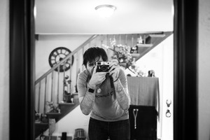 In this candid mirror selfie, the subject focuses intently on capturing the moment with a vintage camera, creating a sense of intimacy and connection. The soft black and white tones accentuate the nostalgic atmosphere, while the surrounding decor hints at a lived-in space filled with stories. Gentle lighting adds warmth to the scene, inviting viewers into a personal narrative.