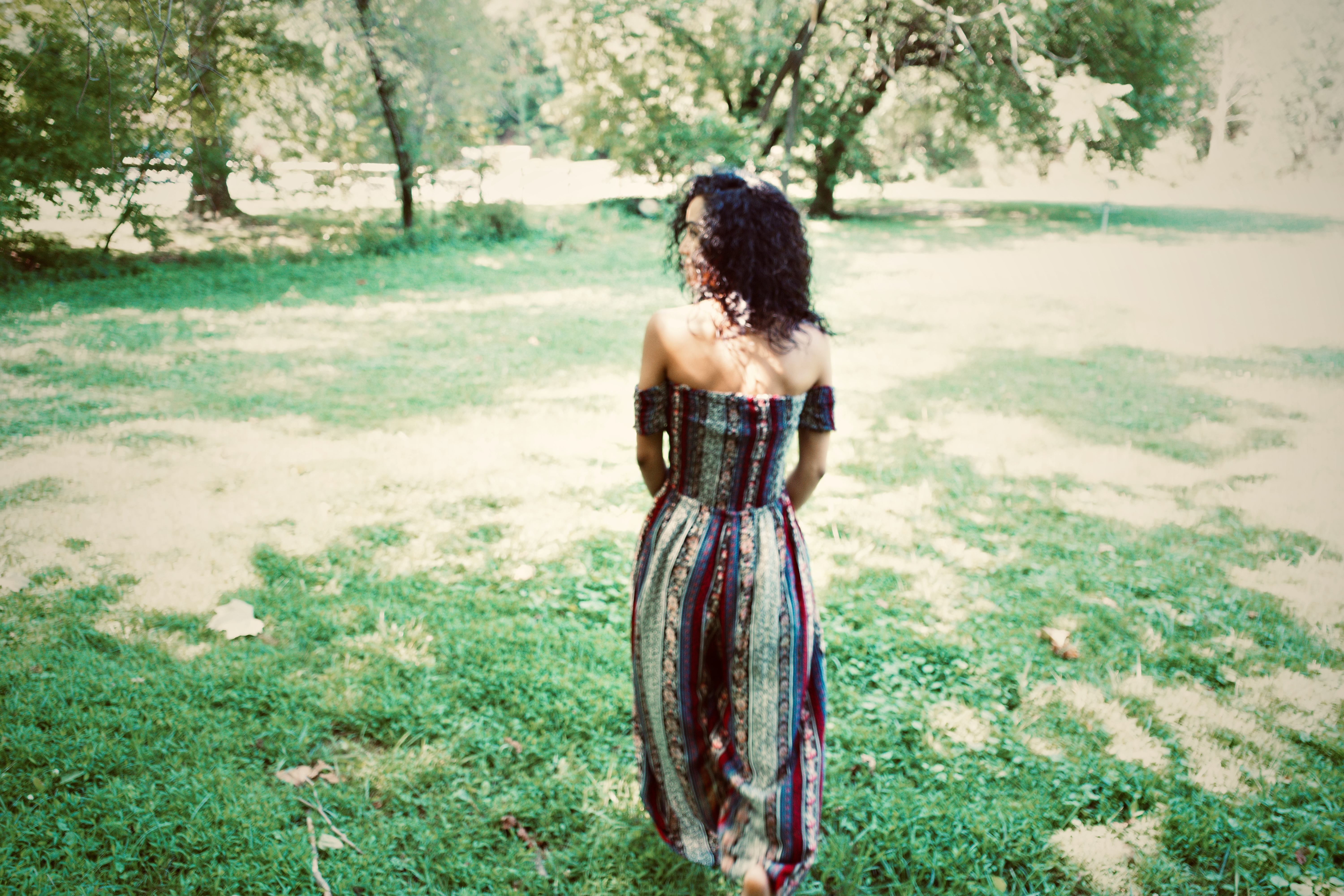 The photograph captures a woman in a patterned dress, standing with her back to the camera, as she walks through a sunlit, grassy field. The soft, diffused light creates a dreamy atmosphere, enhancing the tranquility of the natural setting. The composition invites contemplation, as the subject is immersed in nature, embodying a sense of freedom and reflection.