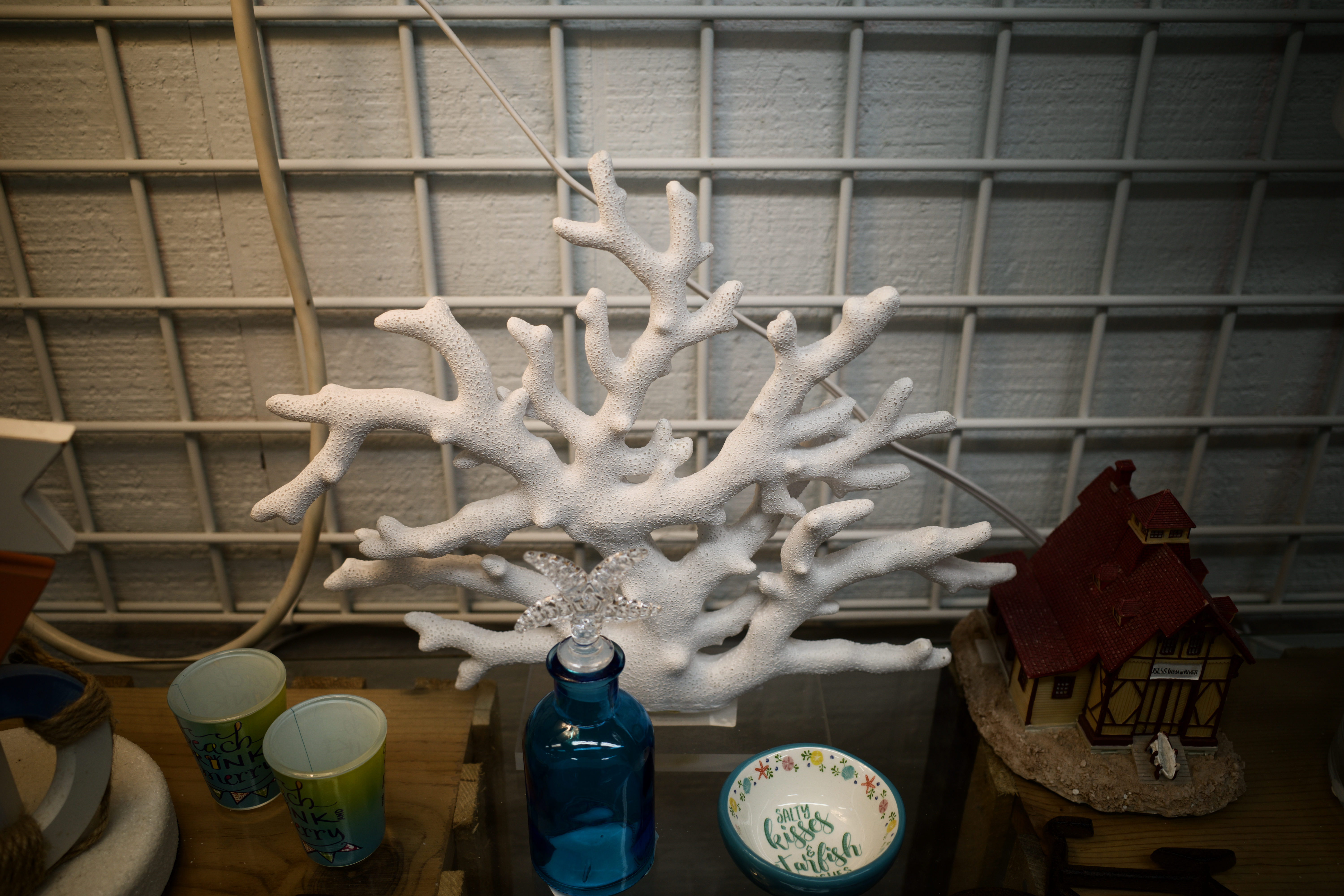 This photograph captures a serene still life arrangement featuring a striking white coral piece at the center, exuding a sense of tranquility and marine inspiration. Soft, diffused lighting creates gentle shadows, enhancing the delicate textures of the coral and surrounding objects, while subtle color pops from the blue bottle and other decorations add visual interest. The composition invites a contemplative mood, reminiscent of coastal memories and natural beauty.
