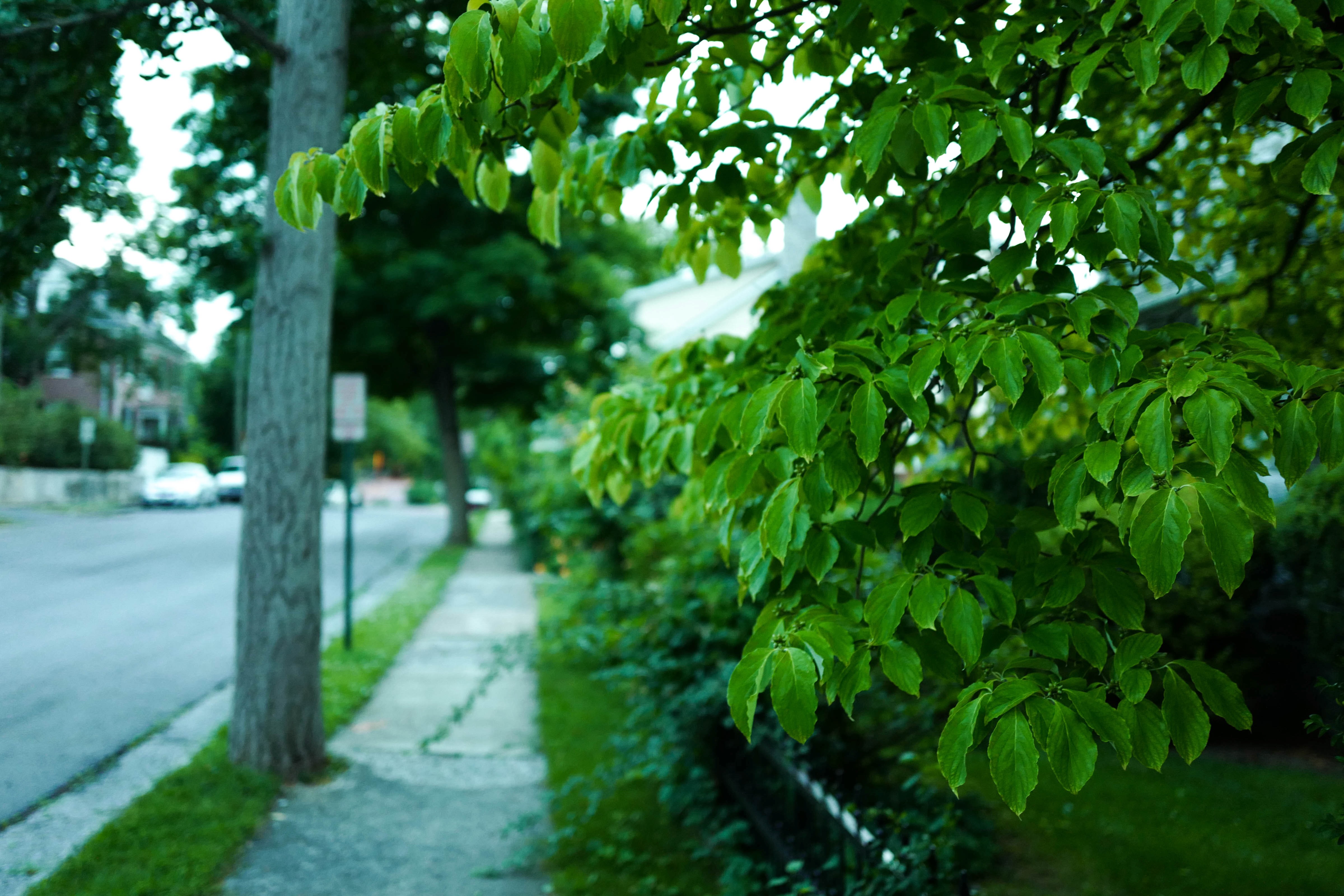 This photograph captures a serene street scene, dominated by lush green leaves that frame the foreground. The soft, cool lighting creates a tranquil mood, inviting the viewer to stroll along the quiet sidewalk lined with trees. A hint of urban life is present in the distant cars and homes, yet the foliage envelops the scene with a calming embrace.