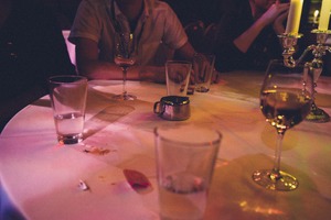 The photograph captures a table in a dimly lit setting, adorned with various glasses and a couple of candle holders, hinting at an intimate gathering. The warm tones of the light create a cozy atmosphere, while the scattered items suggest a mix of conversation and laughter. The focus on the table invites the viewer to feel the presence of unseen company, evoking contemplation and nostalgia.