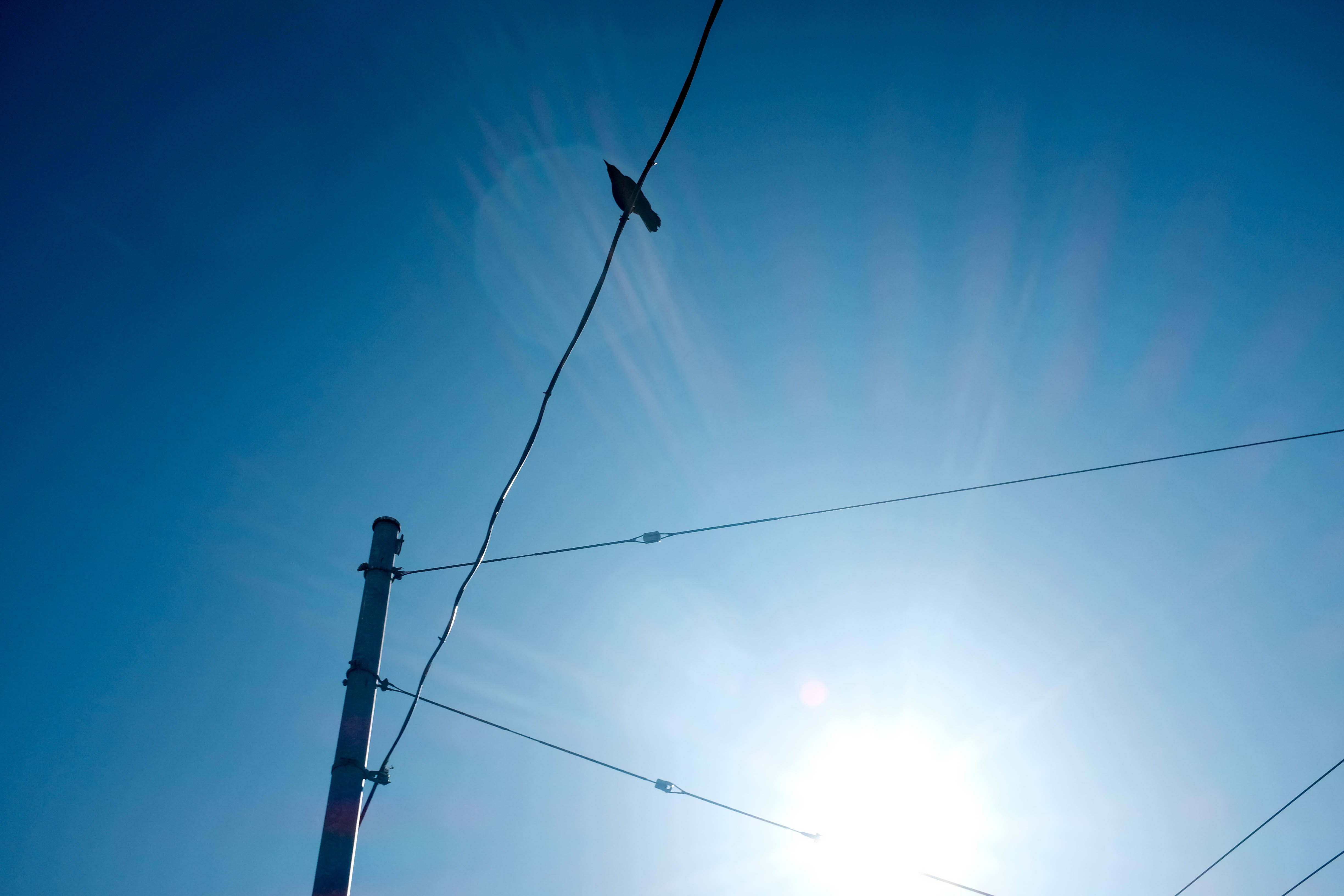 A lone bird perches on a wire, silhouetted against a bright, expansive sky. The sun radiates behind it, casting vibrant flares that enhance the sense of tranquility and freedom. This minimalist composition evokes feelings of solitude and contemplation in the vastness above.