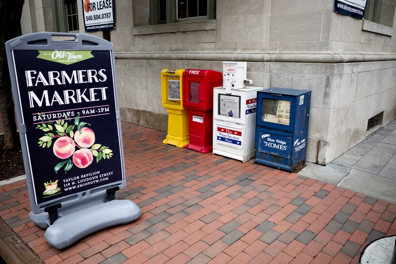 A vibrant sign announcing the farmers market stands prominently on a quaint sidewalk, inviting visitors to experience local produce. Nearby, colorful newspaper vending boxes add a splash of color against the neutral stone facade, creating a charming urban composition. The muted lighting evokes a serene atmosphere, hinting at a cloudy day, perfect for exploring the neighborhood's local offerings.