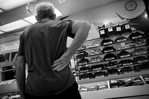 In a soft black-and-white composition, an elderly man stands hunched, contemplating a colorful display of sweets. The lighting casts gentle shadows, enhancing the nostalgic mood as he absorbs the moment, lost in thought. The juxtaposition of his silhouette against the vibrant candies evokes a sense of whimsy and reflection.