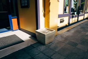 The photograph captures a solitary planter nestled against a brightly colored wall, infusing the scene with a casual elegance. Sunlight casts sharp, contrasting shadows, creating a vibrant interplay of light and texture on the tiled ground. The overall mood feels tranquil yet alive, highlighting the subtle beauty of urban life.