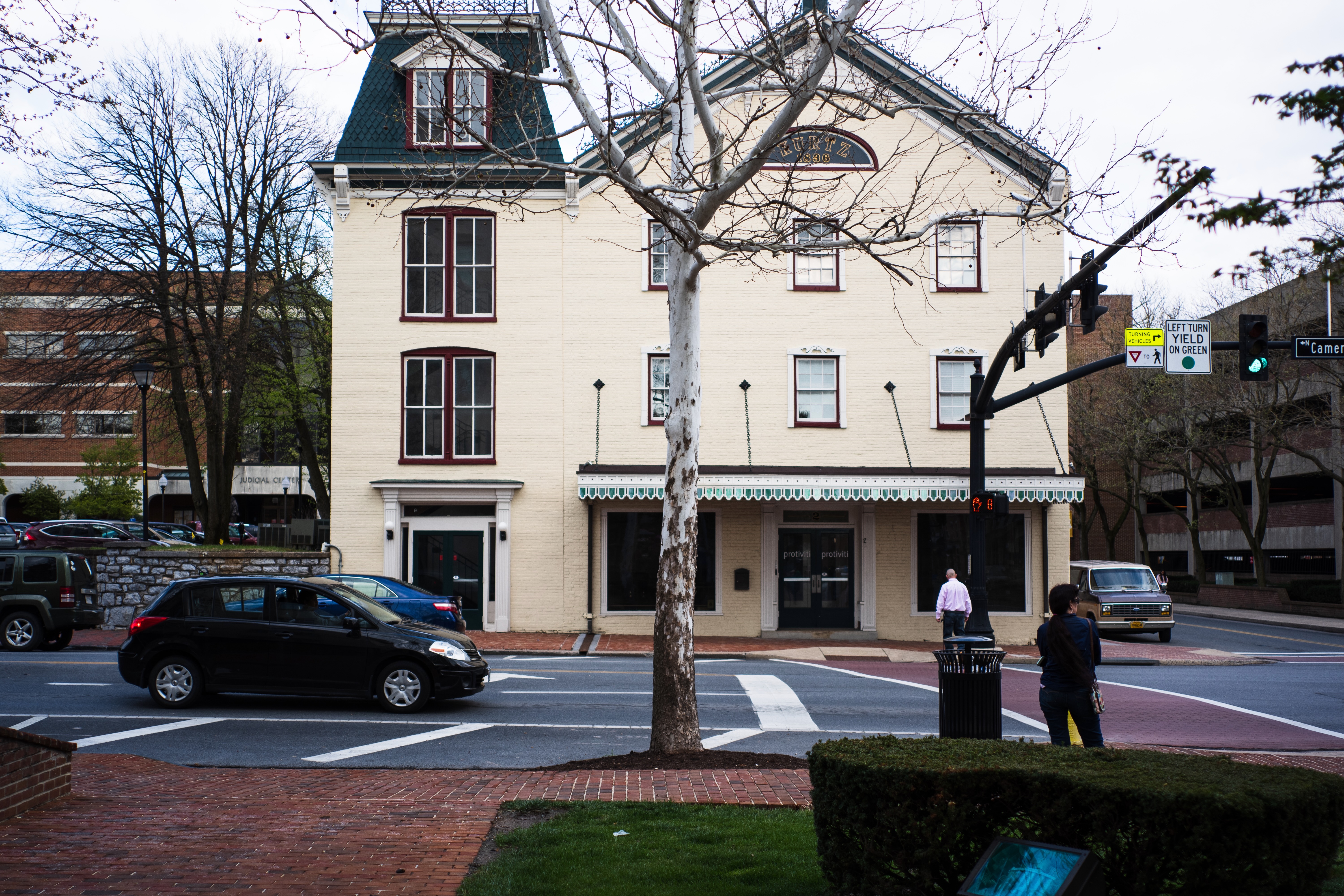 This photograph captures a quaint urban scene, dominated by a stately building with a vintage facade. The composition balances elements of movement, as cars traverse the intersection while pedestrians navigate the sidewalk. Soft, diffused lighting contributes to a serene yet bustling atmosphere, bridging the elegance of the architecture with the everyday rhythm of city life.
