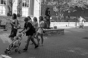A bustling street scene captures a diverse group of individuals moving through a lively urban area. The black and white composition adds a timeless feel, contrasting the vibrant lives of the passersby with the serene backdrop of an acoustic performer. Soft daylight filters through the trees, creating a warm yet lively atmosphere as each character weaves their own story in this shared space.