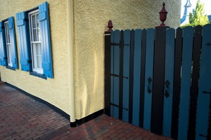 This photograph captures the vibrant juxtaposition of a yellow wall adorned with striking blue shutters against a shadowy, dark wooden gate. The warm sunlight casts gentle shadows, enhancing the inviting yet secretive ambiance of the scene. The composition draws the eye from the cheerful windows towards the mysterious gate, suggesting a transition between openness and enclosure.