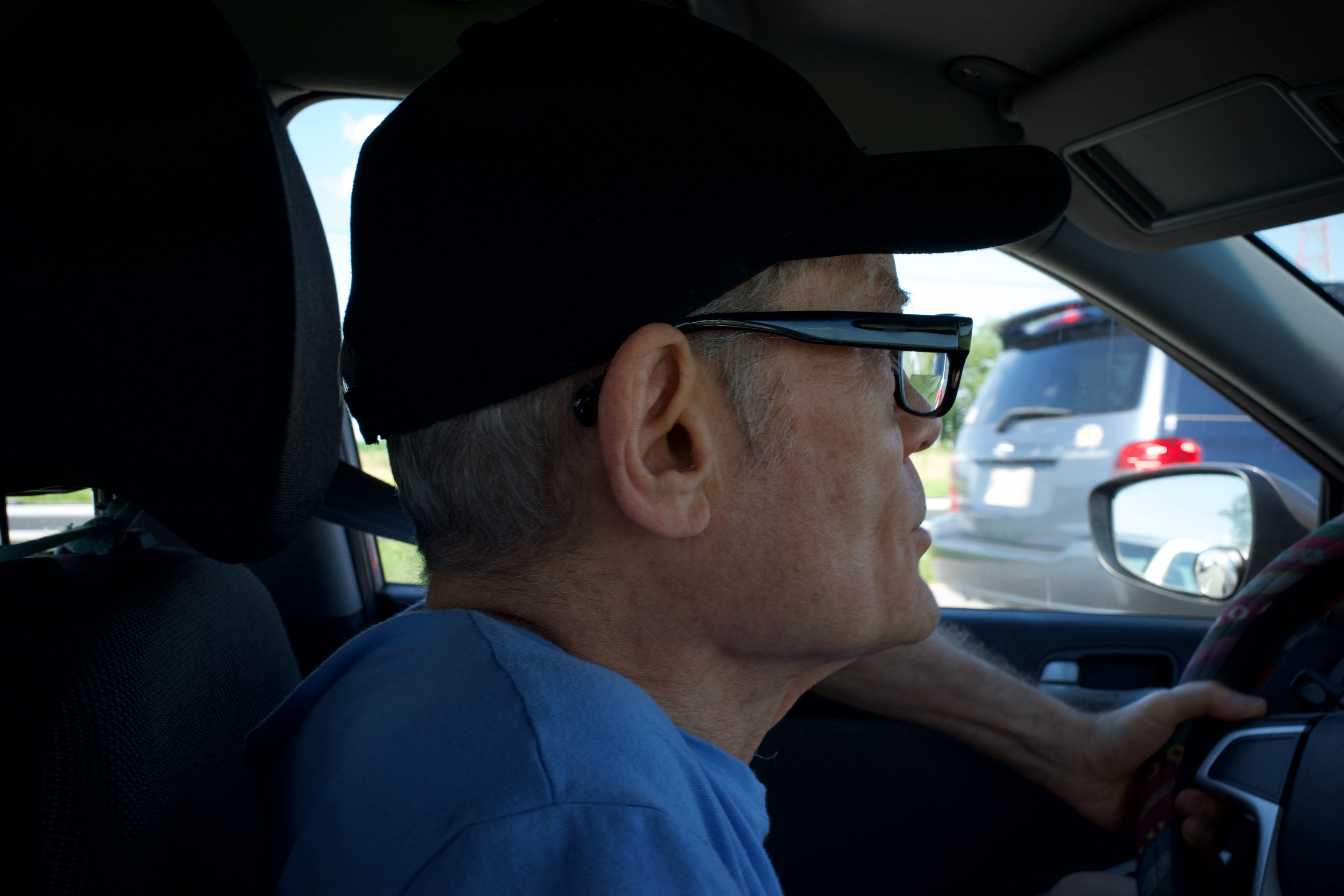 This profile shot captures an older man driving, his concentration apparent in the slight furrow of his brow. The interior lighting casts a soft glow on his face, while the blurred traffic outside hints at a bustling world beyond him. The mood evokes both serenity and introspection, suggesting a moment of quiet contemplation amidst the chaos of the road.