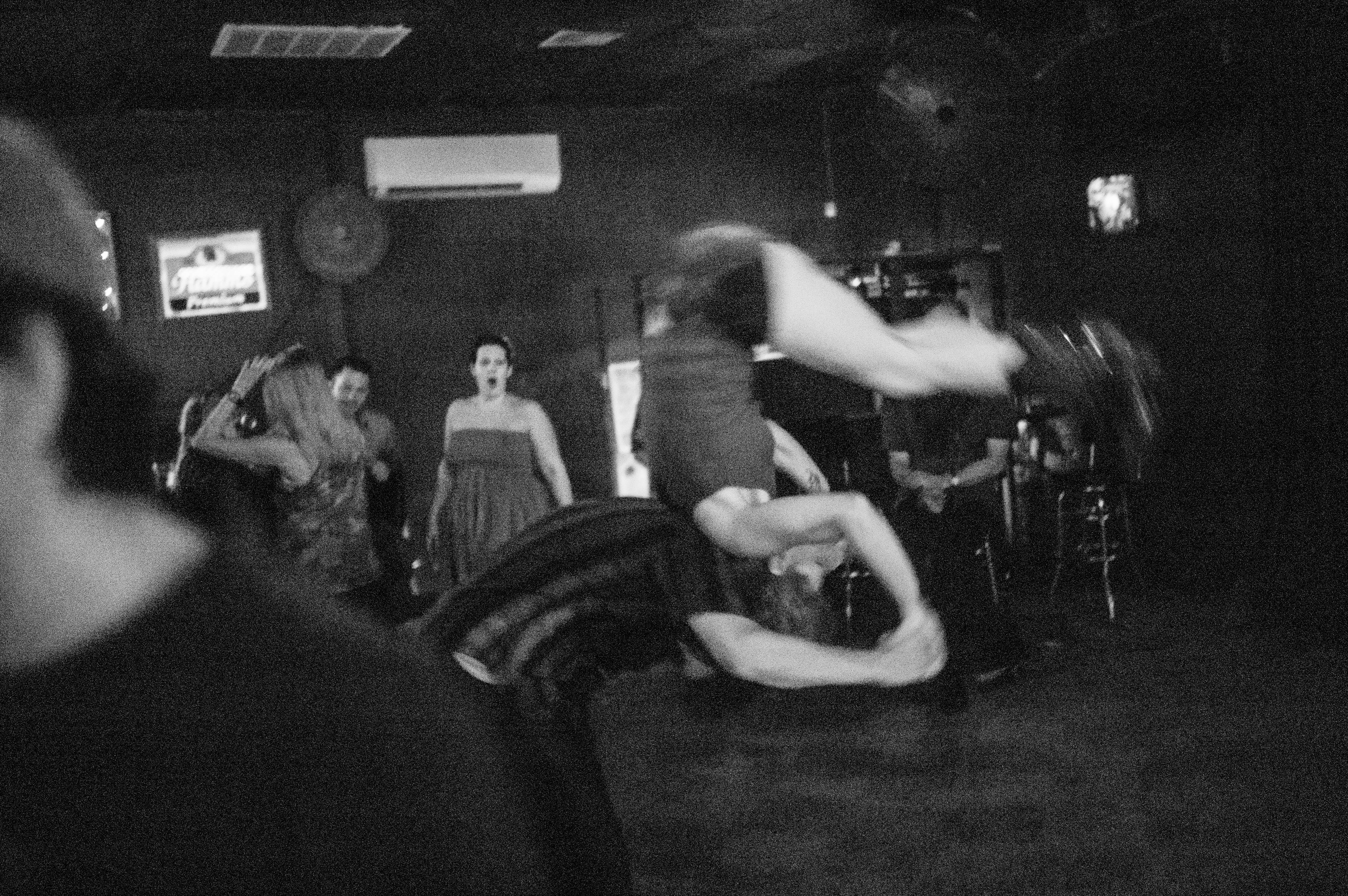 This dynamic black-and-white photograph captures a lively moment in a dimly lit venue, where a dancer performs an impressive acrobatic move while another individual spins energetically nearby. The composition emphasizes movement, drawing the viewer's eye to the contrast between in-focus figures and a blurred background. The playful atmosphere is conveyed through the expressions of both the performers and the captivated audience, illuminated by soft ambient light.