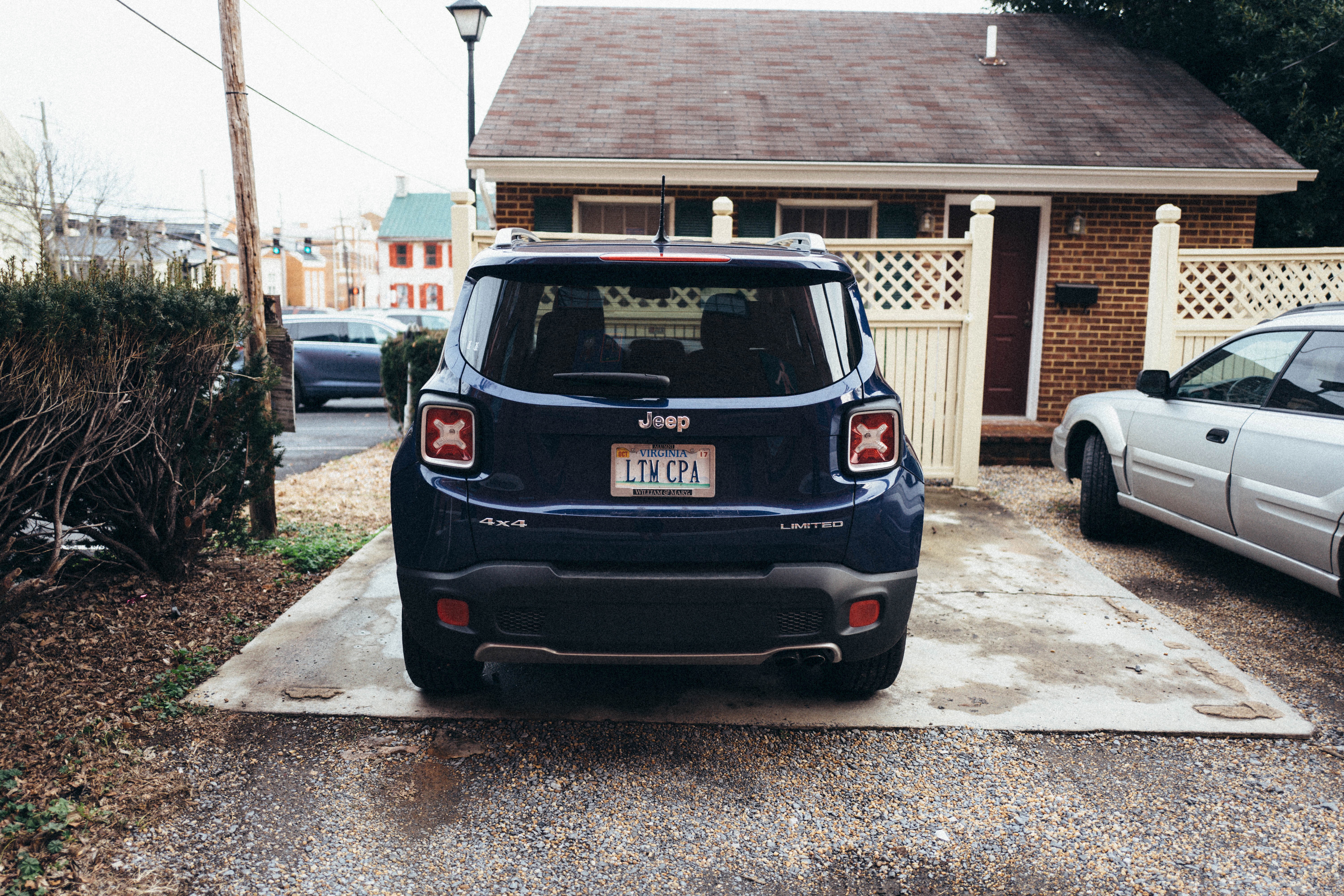 The photograph captures a blue Jeep parked in a gravel driveway, framed by hedges and a quaint brick house with subtle lighting. A muted palette enhances the contemplative mood, emphasizing a quiet moment in an urban setting. The composition draws the eye to the vehicle's unique license plate, suggesting a personal touch amidst the everyday scene.