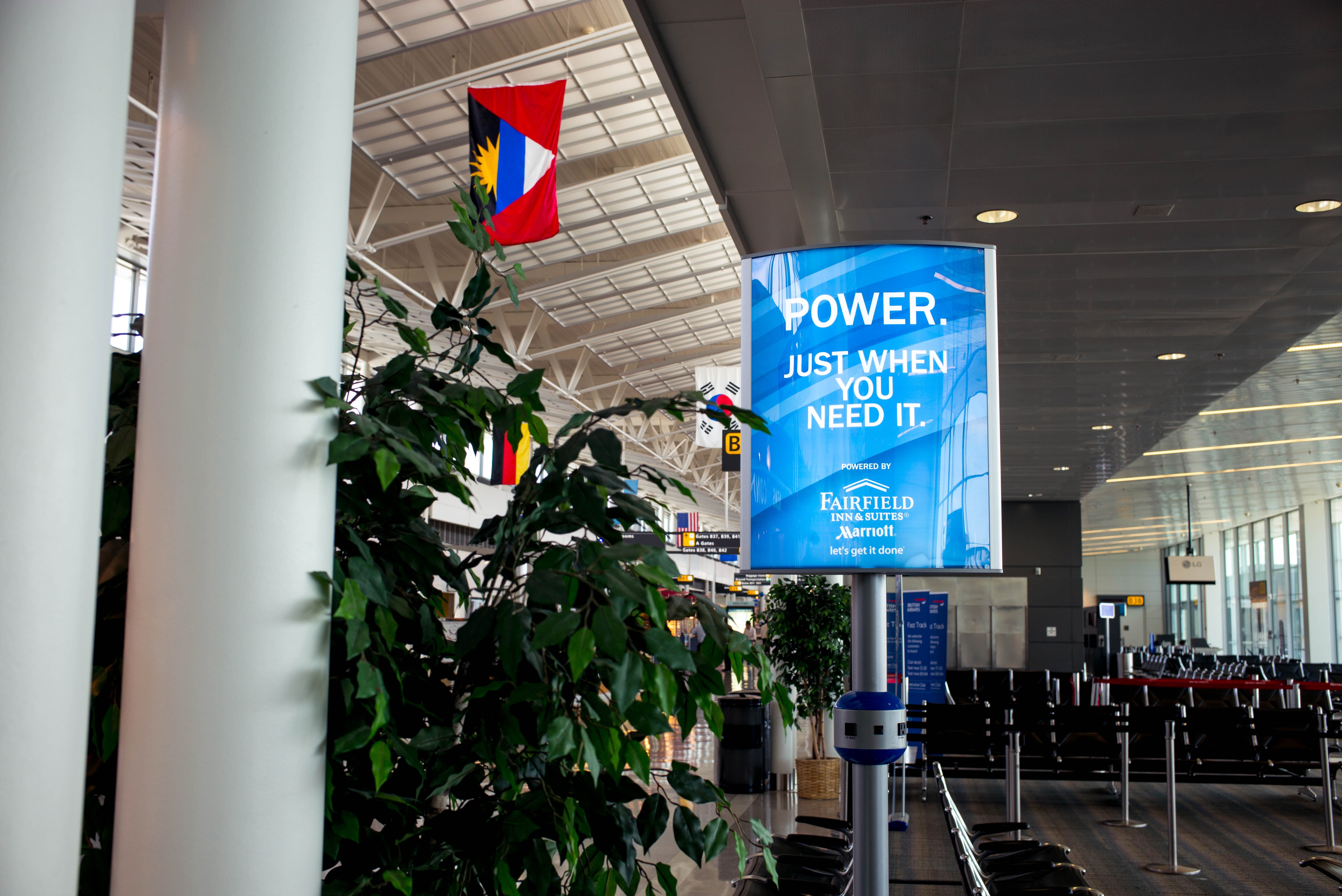 This photograph captures a well-lit airport terminal scene, focusing on a vibrant advertisement for a hotel service, proclaiming 'Power. Just when you need it.' The composition juxtaposes sleek architecture with lush greenery, creating an inviting yet bustling atmosphere, while the flags in the background add a touch of international flair.