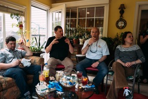 The photograph captures a relaxed gathering of friends seated in a cozy sunlit room, adorned with lush indoor plants that enhance the warm ambiance. The mood is conversational and lively, as gestures and laughter fill the space, while drinks and snacks are casually placed on the table, reflecting a comfortable camaraderie. The soft, natural light streaming through the windows adds an inviting glow, highlighting the diverse expressions of enjoyment among the group.