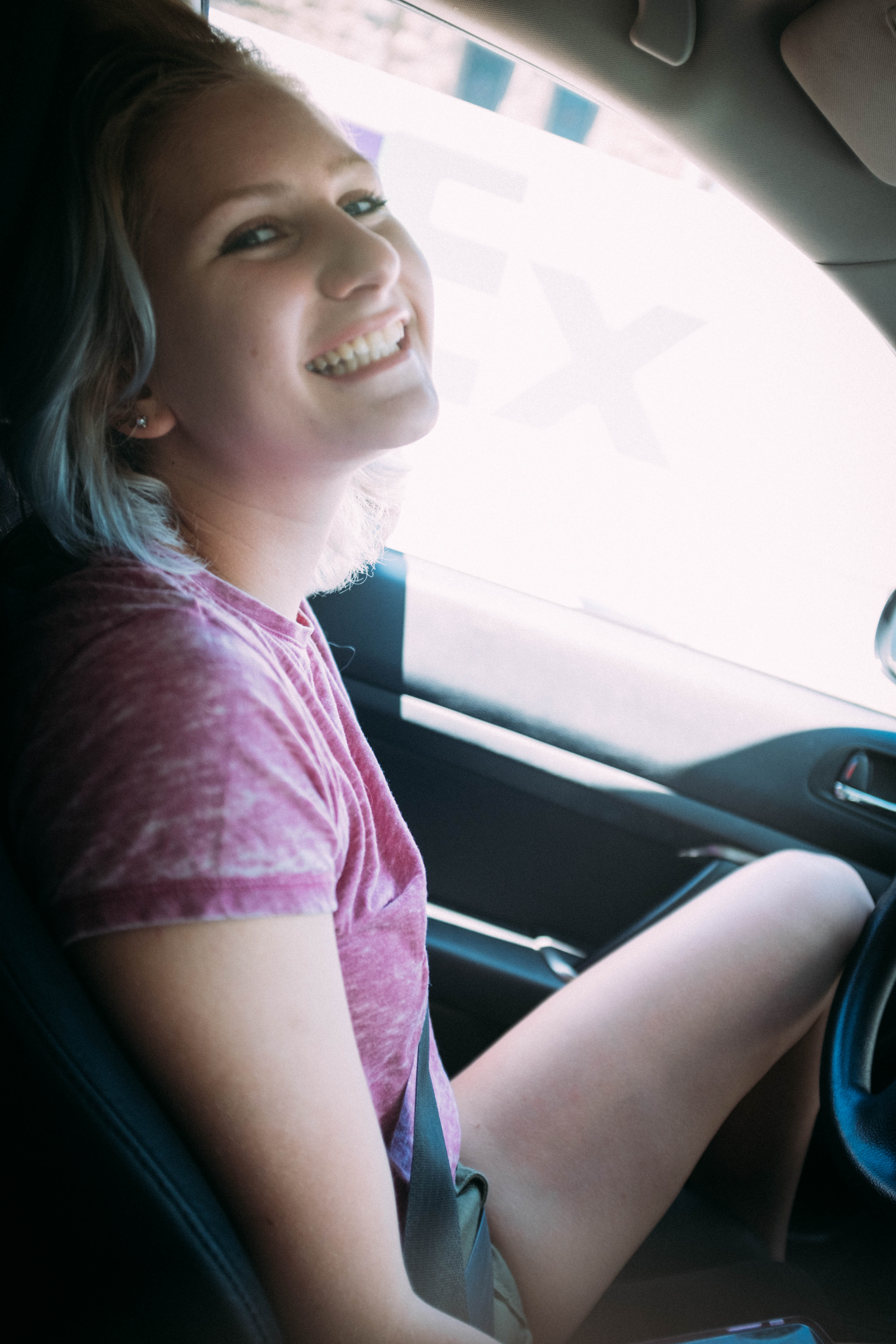 In a sunlit car interior, a young woman beams with joy, her carefree smile reflecting the warmth of the day. Soft light dances across her features, accentuating the relaxed vibe of summer adventures. The composition invites the viewer into this moment of spontaneity and happiness, framed by the softness of the passenger seat and the calm backdrop outside.