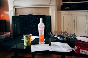 A cluttered coffee table features a striking bottle of KINKY vodka at its center, surrounded by scattered letters and a can of green food. The warm lighting from a nearby lamp creates an inviting yet casual atmosphere, hinting at moments of relaxation and social interaction. The contrast of the dark table against the vibrant colors of the vodka and the soft backdrop evokes a sense of intimacy in a lived-in space.