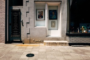 A captivating glimpse into a modest storefront displays framed artworks, inviting curiosity from passersby. The sunlight casts soft shadows, highlighting the textures of the aged wall and the warm tones of the pavement. The juxtaposition of the vibrant images against the muted exterior evokes a sense of nostalgia and artistic allure.