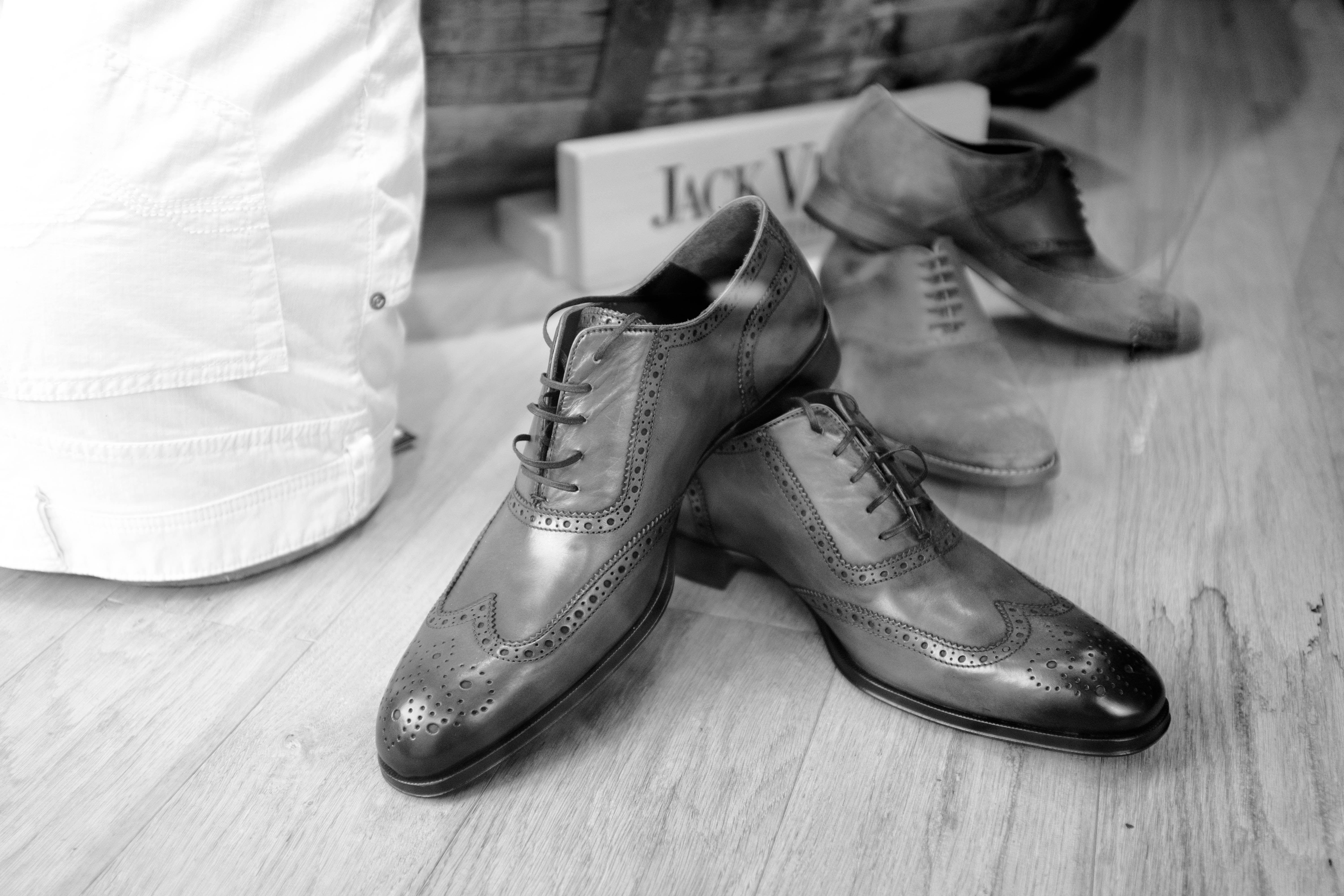 This black-and-white photograph showcases a pair of polished brown dress shoes, exuding sophistication and craftsmanship. The softly lit scene highlights the intricate detailing of the shoes against a warm wooden floor, while a casual vibe is introduced by the visible pant leg in the foreground. The subtle atmosphere invites contemplation of style and comfort.