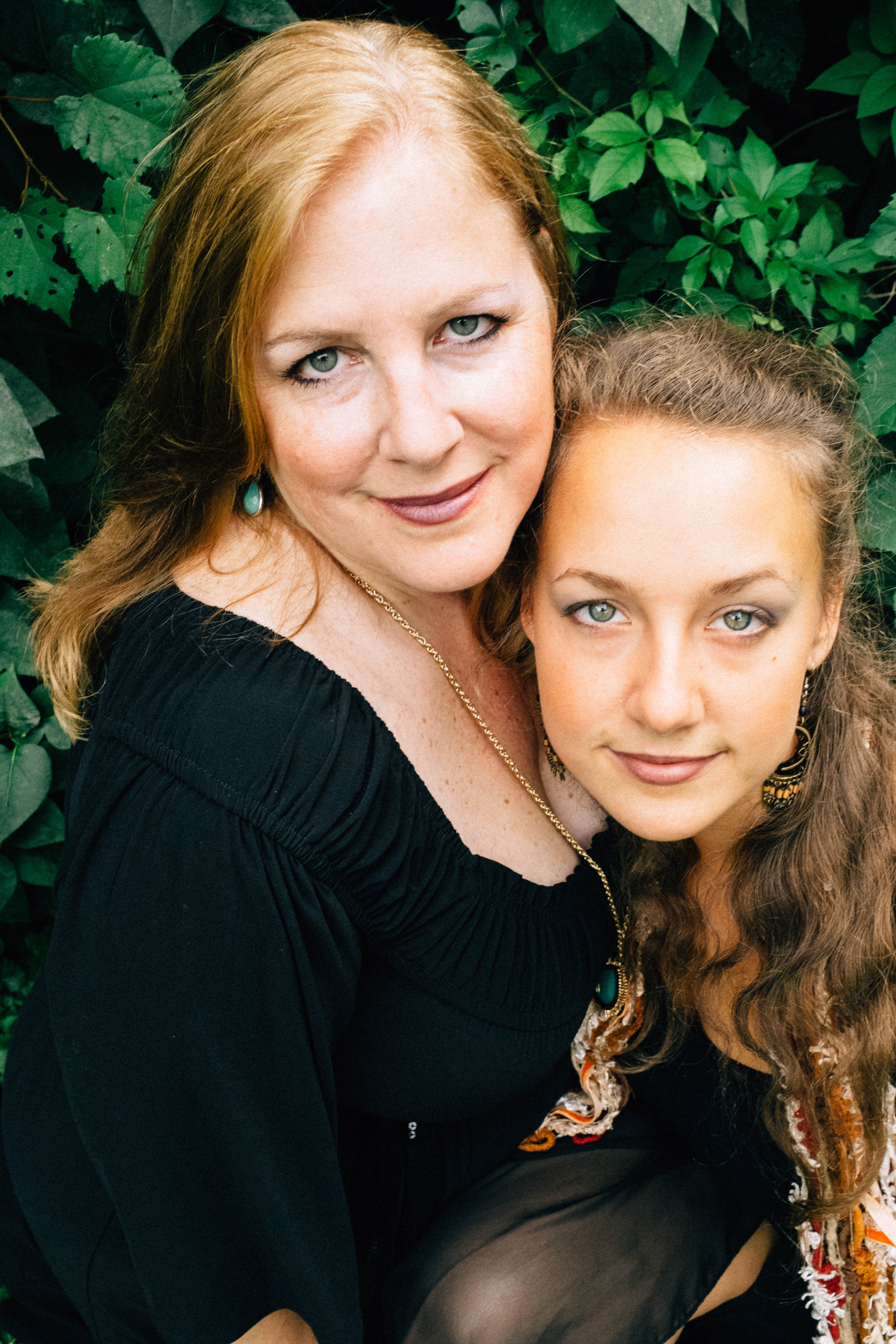 The photograph captures a tender moment between a mother and daughter, their faces framed by vibrant green foliage. With soft, diffused lighting, the intimate expression and serene gazes evoke a sense of deep connection and warmth. The careful composition highlights their closeness, blending natural beauty with familial bonds.