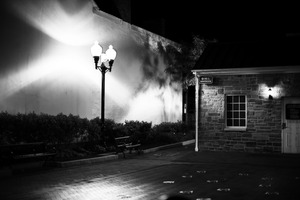 A solitary vintage lamp stands illuminated against a stark, shadowy wall, casting soft light on the nearby benches and cobblestone path. This black and white composition evokes a sense of quiet solitude, as the interplay of light and shadow creates a moody atmosphere. The simplicity of the scene invites contemplation, highlighting the beauty found in urban nightscapes.