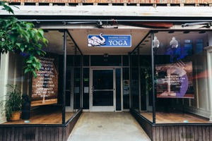 The photograph captures the inviting entrance of a yoga studio, framed by lush greenery that adds a touch of natural tranquility. The soft, diffused lighting enhances the warm, welcoming atmosphere, while motivational quotes on the windows evoke a sense of introspection and possibility. The composition draws the eye towards the studio's calm aesthetic, creating a peaceful escape from the bustling city.