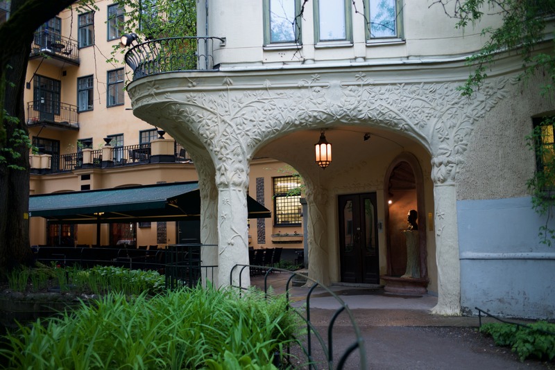 This photograph captures an intricately carved archway, inviting visitors into a hidden realm. Soft, warm lighting enhances the ornate details and evokes a sense of nostalgia and serenity, while lush greenery frames the scene, adding a touch of nature's tranquility. The composition juxtaposes the architectural elegance against the subdued backdrop of the building, creating a harmonious blend of beauty and charm.