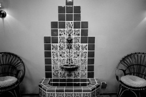 The photograph showcases a beautifully tiled fountain, embellished with intricate floral patterns, as the central subject. Flanking the fountain are cozy wicker chairs, inviting relaxation in a tranquil atmosphere. The soft lighting casts gentle shadows, enhancing the serene mood of this intimate space.
