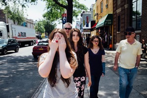 In a bustling urban street, a group of four people walks along the sidewalk, all absorbed in their own worlds. The sunlight casts vibrant shadows and highlights, emphasizing the carefree mood of a sunny day, while one young woman playfully conceals her face, adding an element of spontaneity to the moment. The juxtaposition of their expressions and styles creates a lively, candid snapshot of city life.