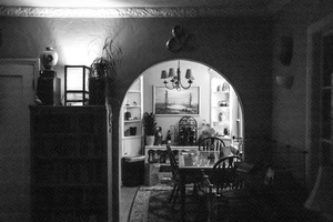 This black-and-white photograph captures a cozy dining area framed by an ornate archway, where soft shadows play against the warm glow of overhead lights. The composition suggests an inviting yet slightly nostalgic mood, evoking a sense of tranquility and intimate gatherings. Shelves lined with curiosities and a hint of lush greenery enhance the space's charm, as the dim lighting envelops the room in a soothing embrace.