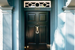 The photograph captures an elegantly painted black door framed by soft blue walls and detailed architectural elements. The warm sunlight casts gentle shadows, creating an inviting atmosphere that hints at mystery and potential. The ornate door knocker adds a touch of sophistication, drawing the viewer’s eye to this tranquil entryway.