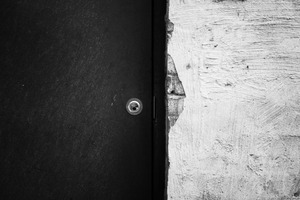 This striking monochrome photograph captures a stark black door juxtaposed against a textured, white wall, suggesting an air of mystery. The composition emphasizes the contrast between the smooth door surface and the rough, peeling paint, creating a sense of neglect but also intrigue. The lighting subtly highlights the texture, evoking curiosity about what lies beyond the entrance, yet leaving the viewer in anticipation and uncertainty.