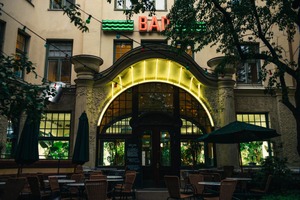 This photograph captures the inviting entrance of a café adorned with vibrant neon lights and elegant architectural details. The interplay of warm yellow lighting against the cool evening hues evokes a cozy, welcoming ambiance, while the lush greenery hints at a serene escape from the bustling city. Outdoor tables set beneath dark green umbrellas suggest a relaxed atmosphere, perfect for leisurely gatherings.