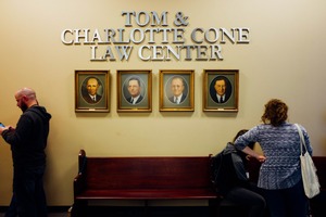 This photograph captures a quiet moment inside the Tom & Charlotte Cone Law Center, where portraits of distinguished individuals hang above a rustic wooden bench. The lighting is soft and warm, creating a contemplative atmosphere as visitors engage with their surroundings, seemingly lost in thought. The juxtaposition of the historical portraits with the modern figures adds depth, inviting viewers to reflect on the legacy of the space.