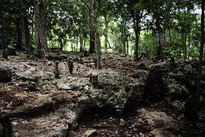 A serene forest floor is captured, adorned with rugged stones and scattered greenery. The interplay of light filtering through the trees creates a tranquil yet mysterious atmosphere, evoking a sense of ancient secrets hidden within the shadows. The composition draws the eye along the rocky path, inviting exploration of this untouched natural haven.