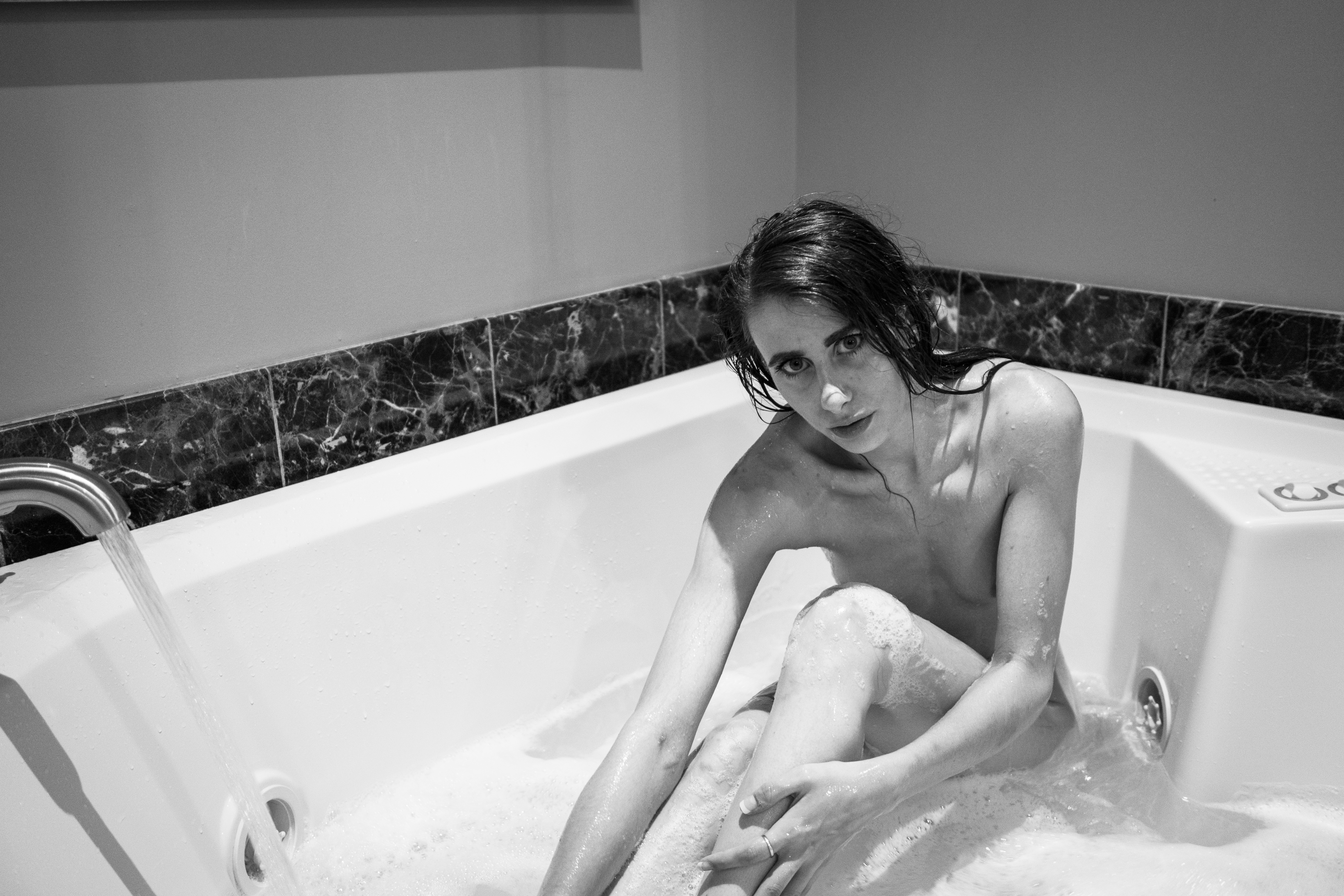 A woman sits in a bubbling, foam-filled bathtub, her gaze direct and contemplative. The black and white tones enhance the moody atmosphere, contrasting with the slick textures of both water and skin. Soft lighting highlights her features, adding depth to the intimate and introspective setting.