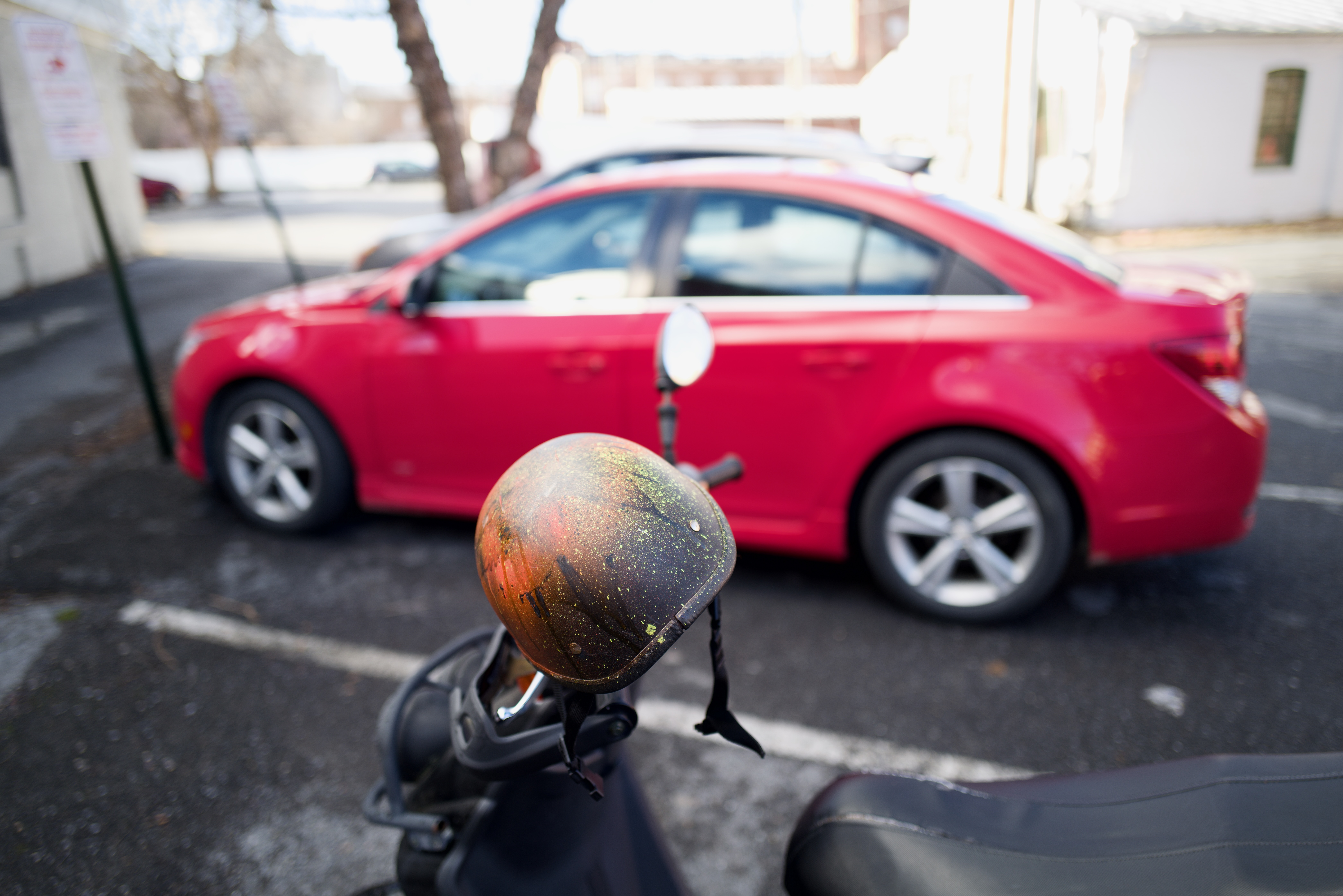 In this photograph, a close-up of a colorful scooter helmet juxtaposes against a softly blurred red car in the background. The bright colors of the helmet pop against the muted tones of the urban setting, creating a playful yet contemplative mood. Natural light casts gentle shadows, enhancing the textures and details of the helmet, while the shallow depth of field draws attention to the intricacies of this everyday moment.