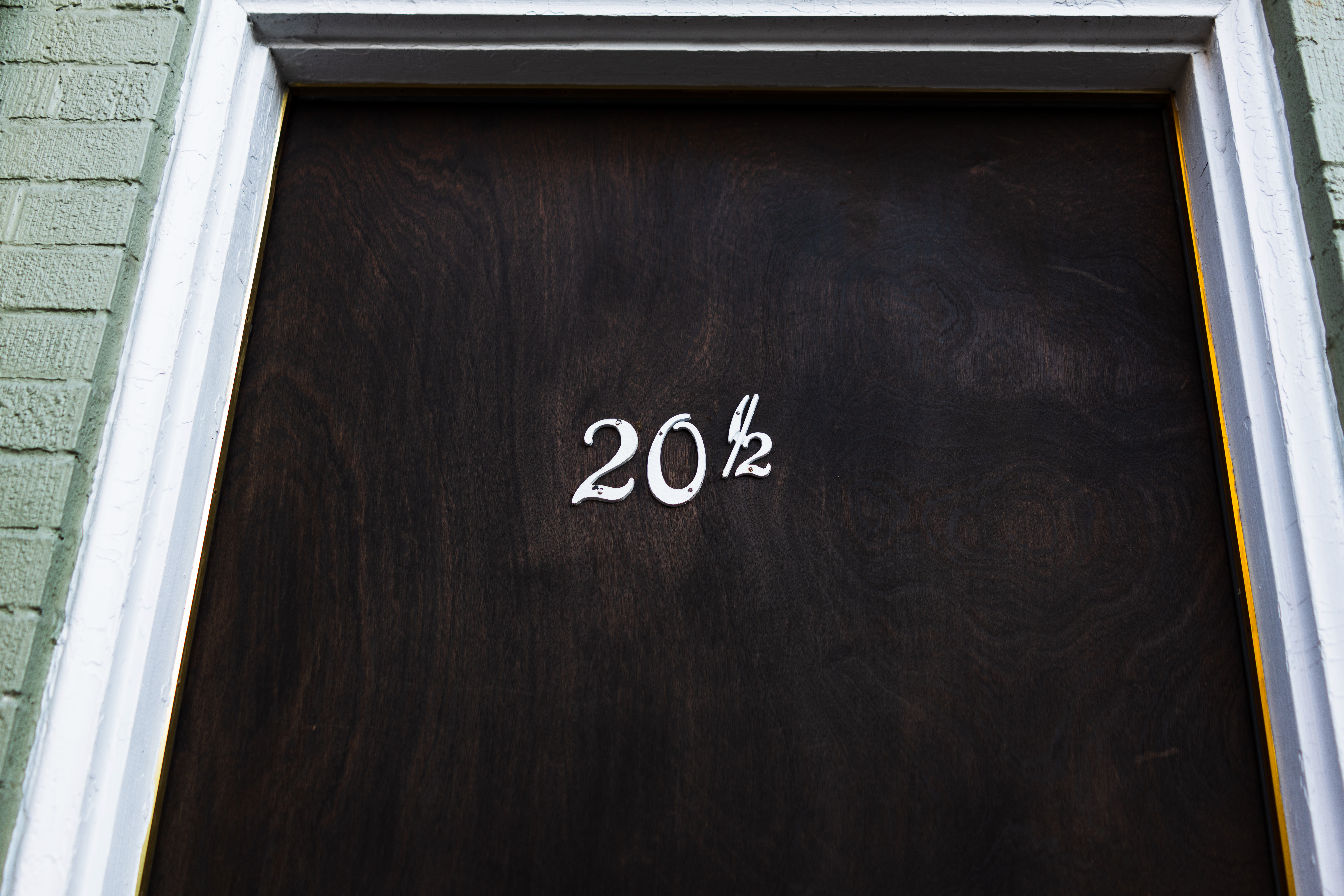 This close-up of a wooden door emphasizes the ornate number '20½', standing out against the dark finish. The muted green wall creates a soothing contrast, enhancing the sense of intrigue and possibility that lies beyond the threshold. Soft lighting reveals the grain of the wood, adding depth and allure to this seemingly ordinary entryway.