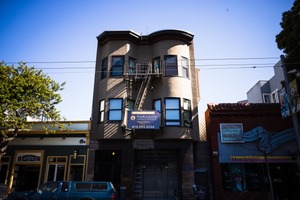 The photograph captures a vintage-style building with a curved rooftop, standing prominently against a clear blue sky. Vivid sunlight casts sharp shadows, enhancing the textures of the facade and the fire escape, while the surrounding greenery adds a touch of life to the urban scene. The overall mood conveys a blend of nostalgia and vitality, inviting curiosity about the stories held within its walls.