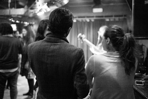 The photograph captures a couple in a dimly lit venue, their backs turned to the viewer as they observe an engaged crowd. The black and white aesthetic enhances the intimate and nostalgic atmosphere, spotlighting the couple's quiet connection against the lively backdrop. Soft lighting casts gentle shadows, emphasizing the mood of introspection in a vibrant social setting.