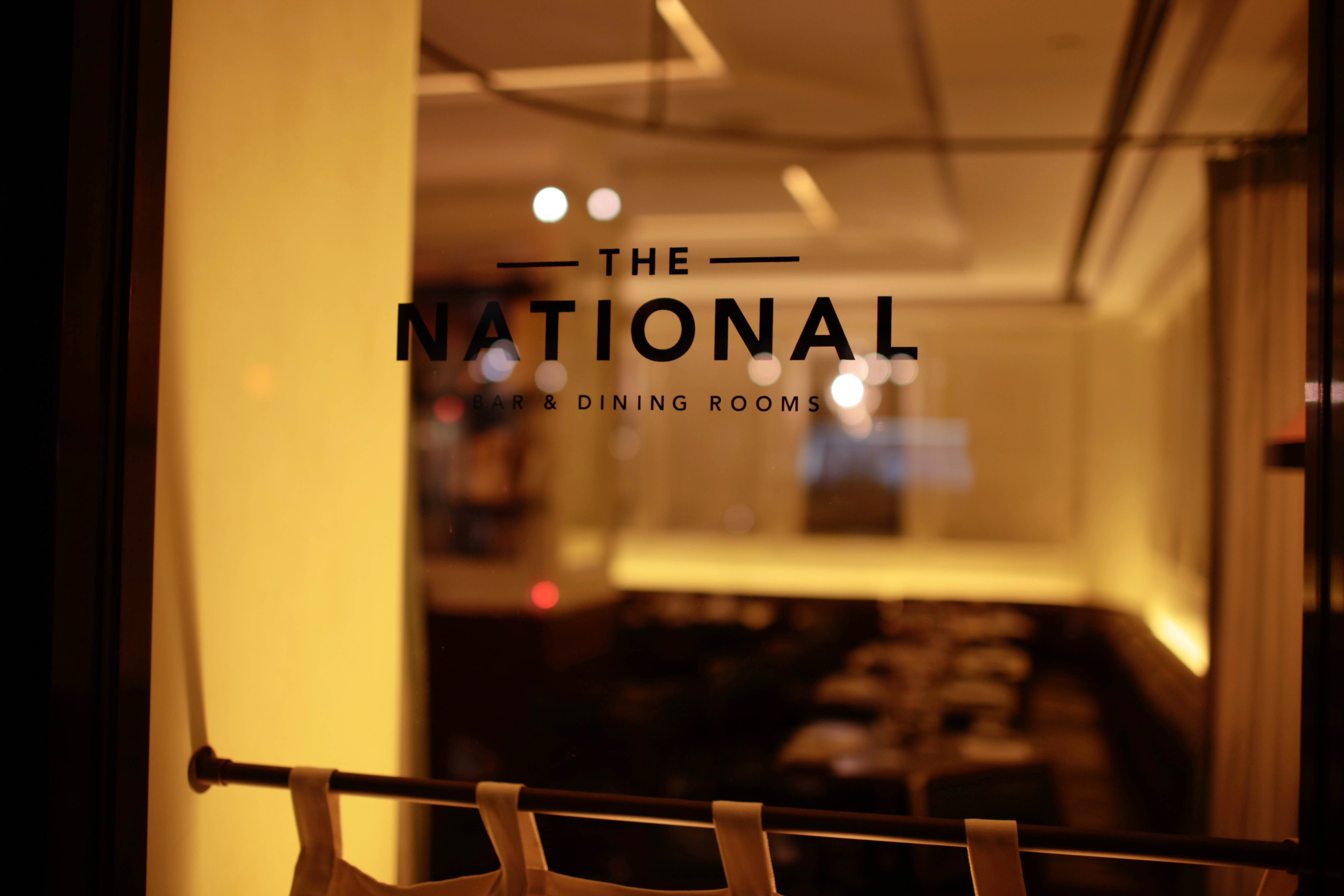 The photograph captures the inviting entrance of 'The National' bar and dining rooms, showcased through a sleek window. The warm lighting casts a cozy glow inside, creating an intimate atmosphere that contrasts with the bustling city outside. The minimalist design of the sign emphasizes modern sophistication and beckons patrons to experience fine dining within.
