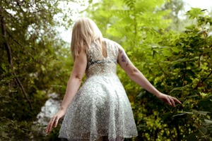 A young woman in a delicate lace dress strides through lush greenery, her back turned to the viewer. The dappled light filters through the leaves, creating a serene, almost ethereal atmosphere. This composition captures a moment of playful exploration, highlighting the connection between the subject and the vibrant natural surroundings.
