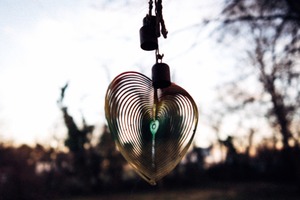A delicate glass heart hangs gracefully in the foreground, its swirling patterns catching the soft twilight glow. The muted backdrop of trees fades into a dreamy blur, enhancing the heart's vibrant colors and inviting warmth. The composition evokes a sense of nostalgia and hope, as the fading light dances through the intricate design.