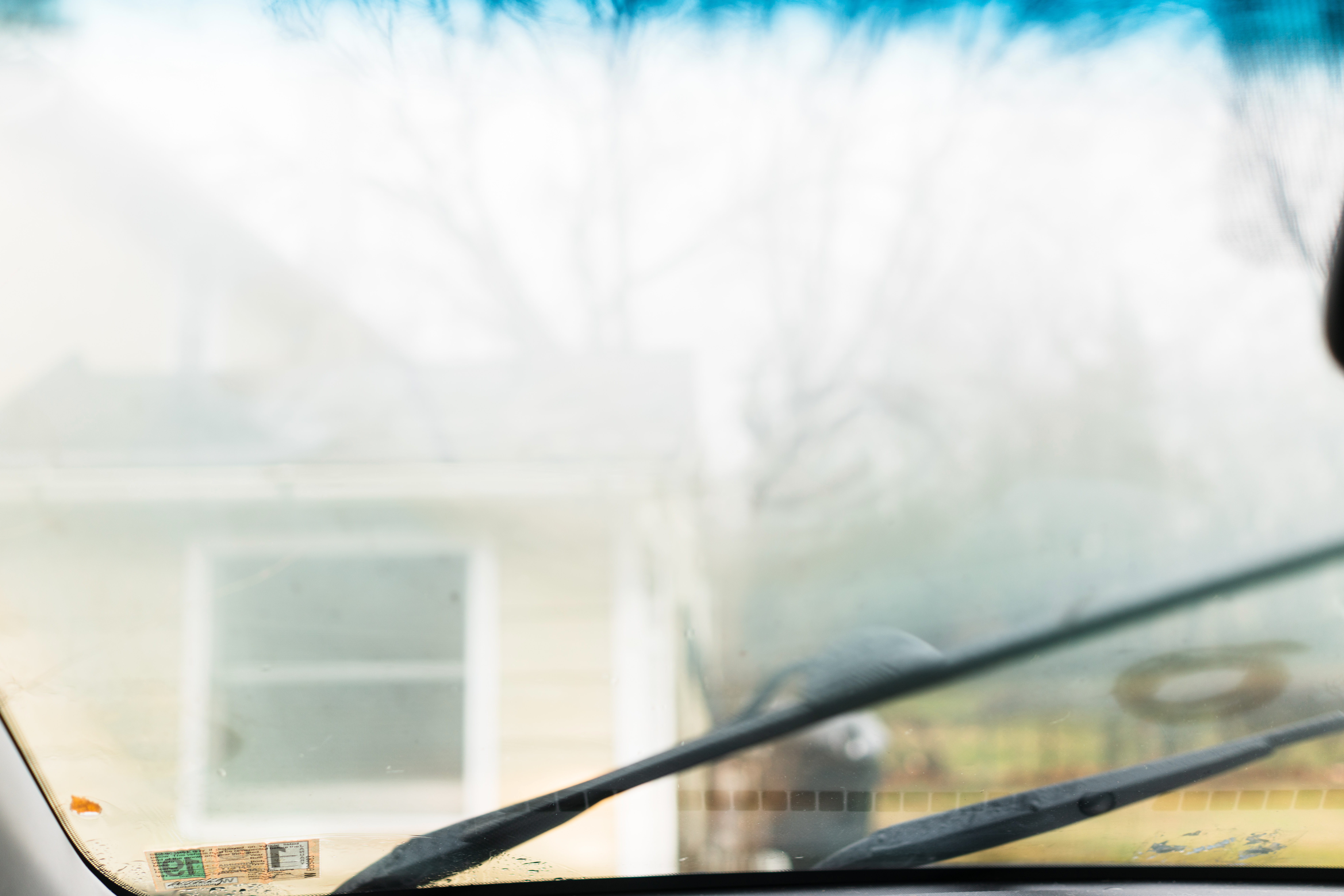 Framed through a foggy windshield, the image captures a muted domestic scene where a house stands in the background, partially obscured by hazy conditions. The smudges on the glass add a layer of intimacy and isolation, evoking a sense of quiet contemplation. Soft, diffused light enhances the melancholic atmosphere, suggesting a moment suspended in time.