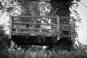 Nestled among cascading ivy, a weathered wooden platform emerges as a secluded sanctuary. The monochrome tones evoke a sense of nostalgia and tranquility, while dappled light filters through the leaves, creating an ethereal atmosphere. This enchanting scene invites viewers to dream of childhood adventures and quiet contemplation amidst the embrace of nature.