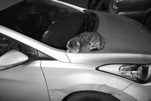 A striped cat peacefully naps on the hood of a silver car, bathed in soft, diffuse light that emphasizes the stillness of the moment. The monochromatic tones enhance the serene mood, contrasting the smooth surface of the vehicle with the textured fur of the sleeping feline. This unlikely pairing creates a poignant snapshot of urban life, where nature finds a cozy refuge amidst human creations.