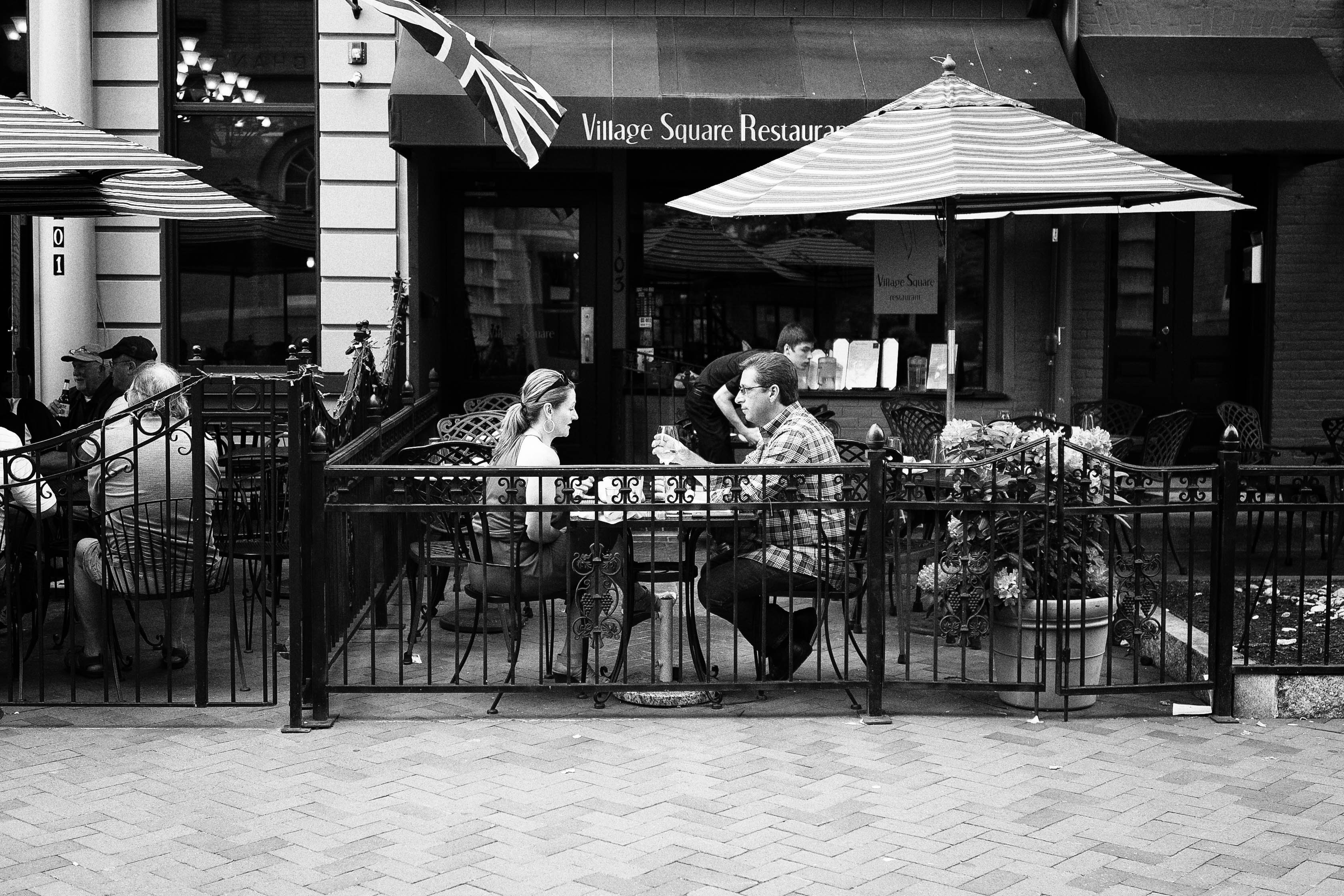 In this black-and-white photograph, a couple sits closely together at a table in an outdoor café, immersed in a quiet conversation that suggests intimacy and connection. The composition is framed by the wrought iron railing and lush flower pots, enhancing the cozy atmosphere, while the soft lighting casts gentle shadows that evoke a serene, leisurely mood. The presence of other patrons in the background adds a sense of community, contrasting with the couple's focused engagement.