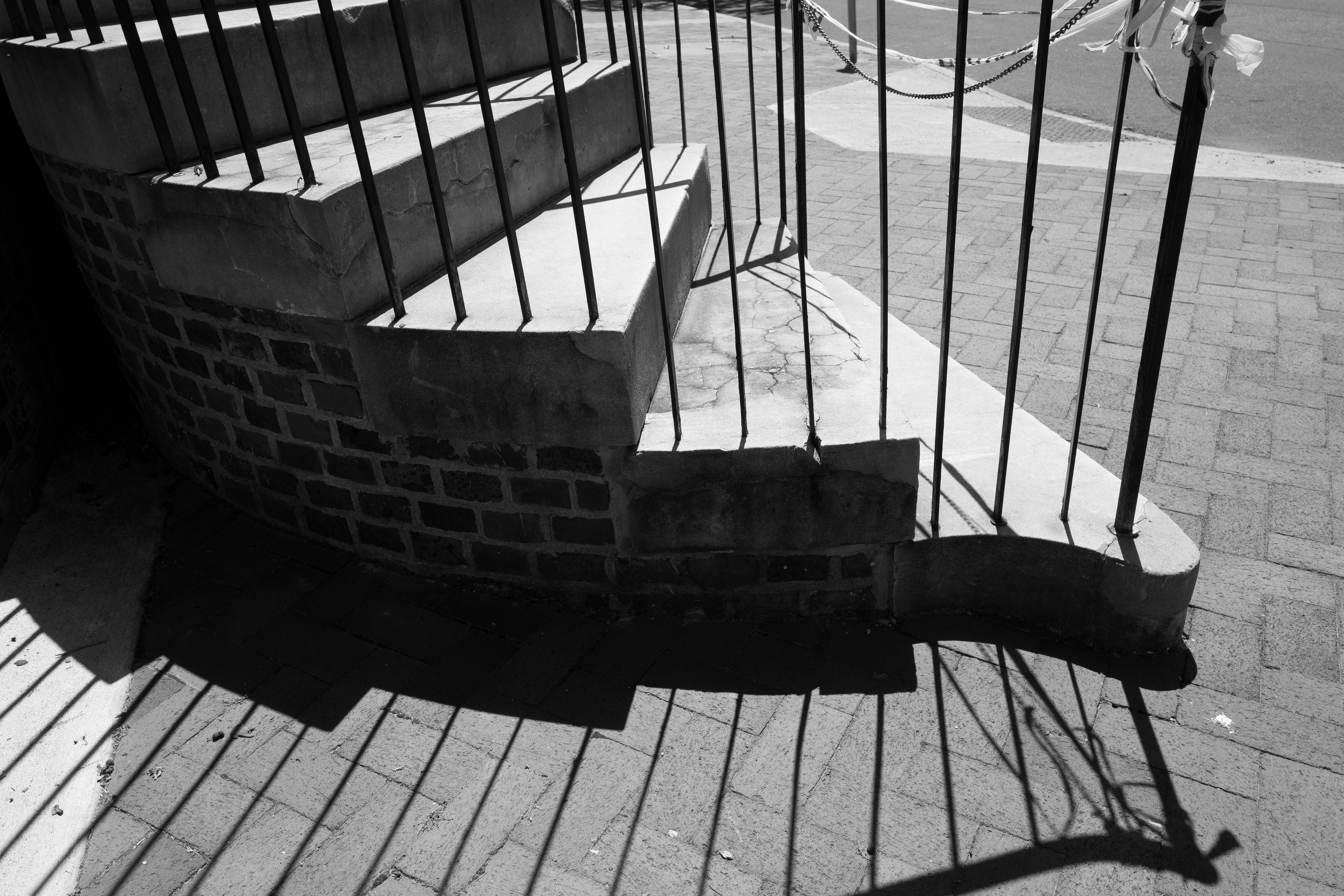 This black and white photograph captures a series of steps merging with wrought iron railings, casting intricate shadows on the brick pathway. The interplay of light and dark creates a moody atmosphere, evoking feelings of introspection and quiet contemplation. The composition focuses on the curves and lines, drawing the viewer’s eye through a labyrinth of texture and geometry.
