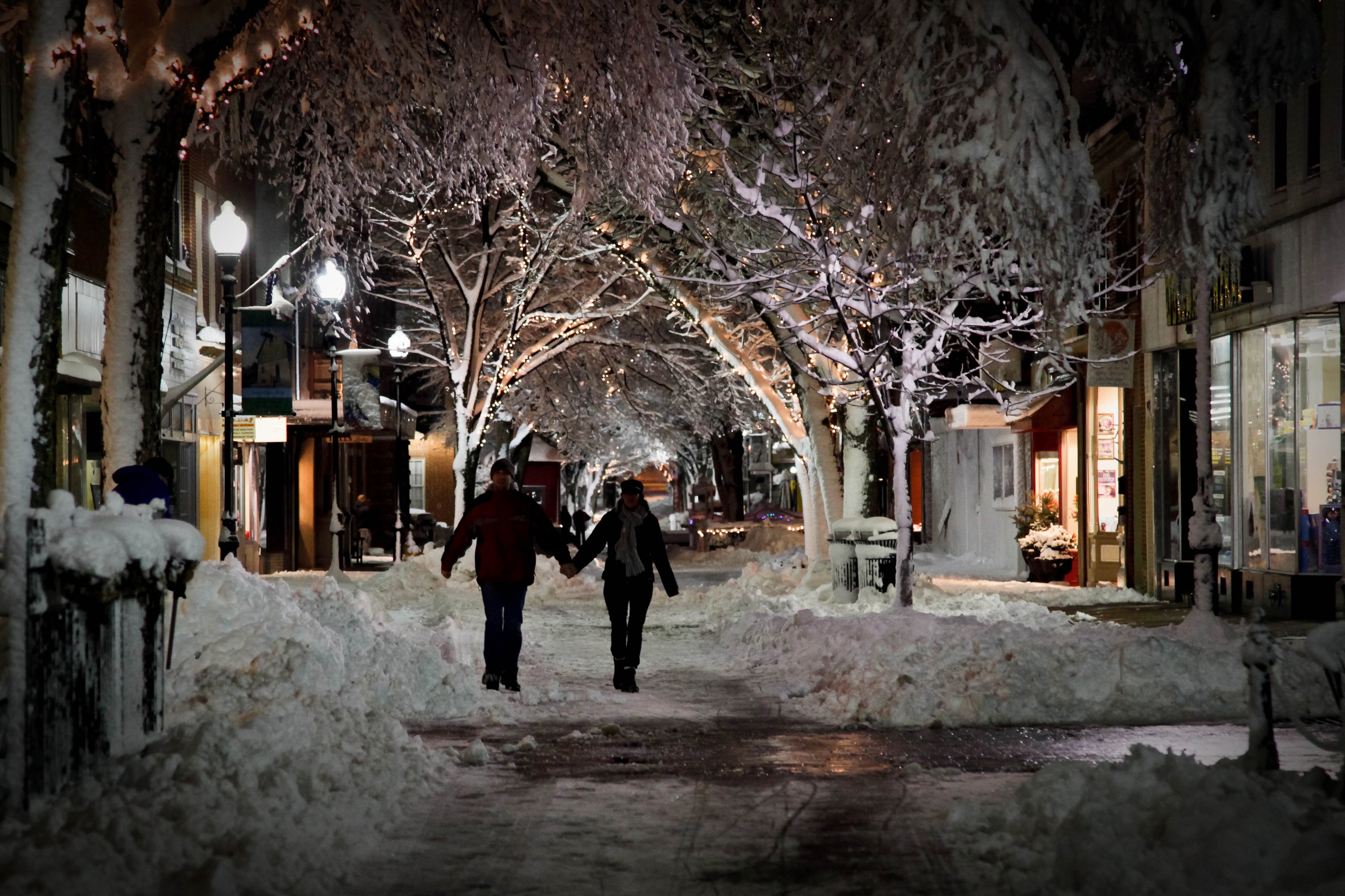Beneath a canopy of snow-laden trees adorned with twinkling lights, a couple strolls hand in hand down a quiet, snowy street. The soft glow from street lamps casts a warm ambience, highlighting the stillness of the winter night. Their shared moment evokes a sense of intimacy and coziness amid the serene, frosty landscape.