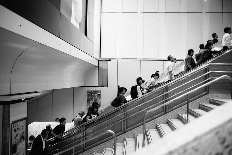 This black and white photograph captures the rhythmic movement of commuters ascending and descending a busy subway staircase. The interplay of light and shadow accentuates the architectural lines and creates a sense of depth, while the focused expressions of the individuals convey the intimacy and isolation often present in crowded urban settings. The overall mood is dynamic, reflecting the pulse of city life amidst the stillness of the moment.