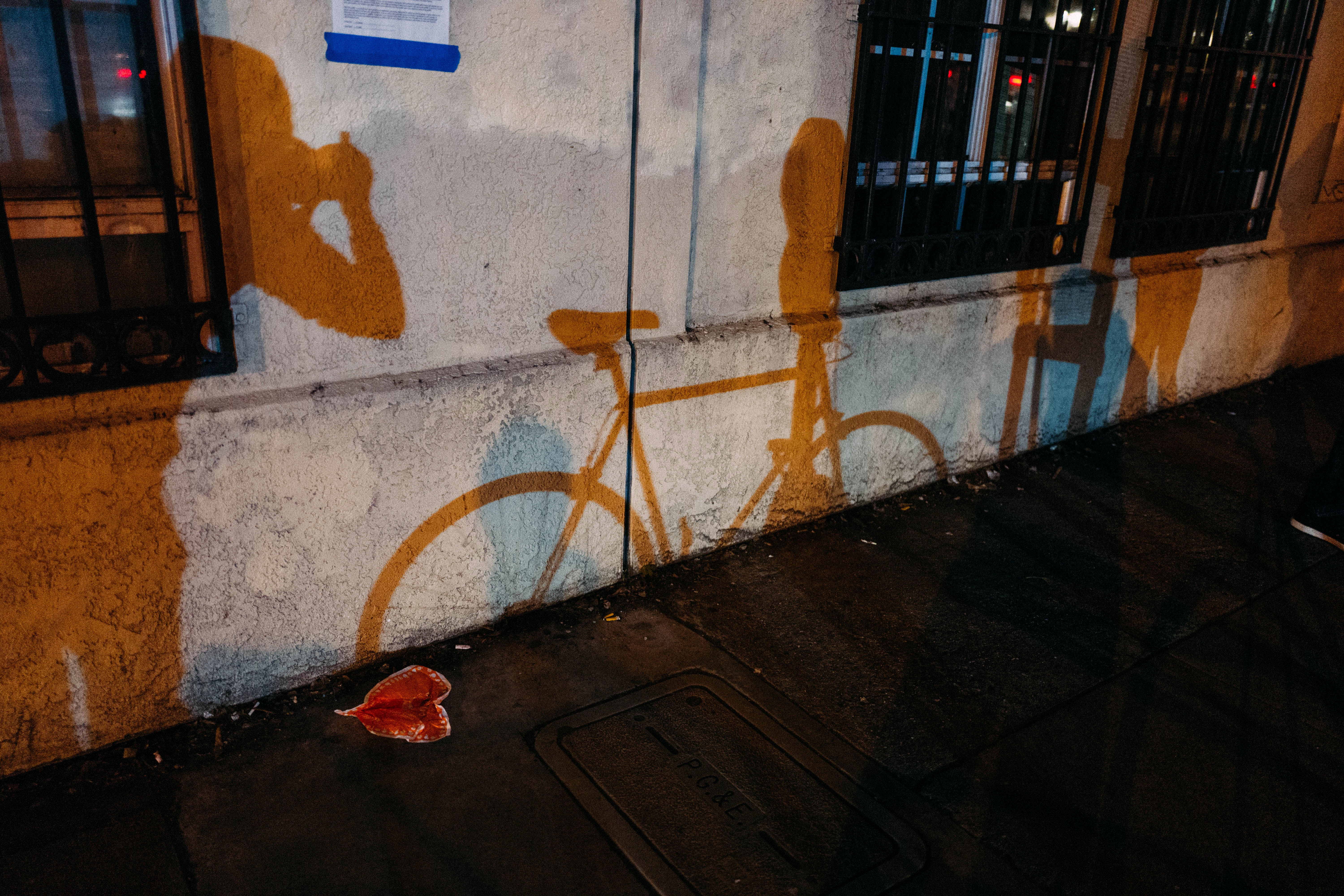 This photograph captures the interplay of shadows cast against a textured wall in a nighttime urban setting. A bicycle shadow emerges prominently, surrounded by silhouettes of people, suggesting a moment of life and movement. The warm orange hues contrast with the cool tones of the wall, creating an intimate yet dynamic atmosphere.
